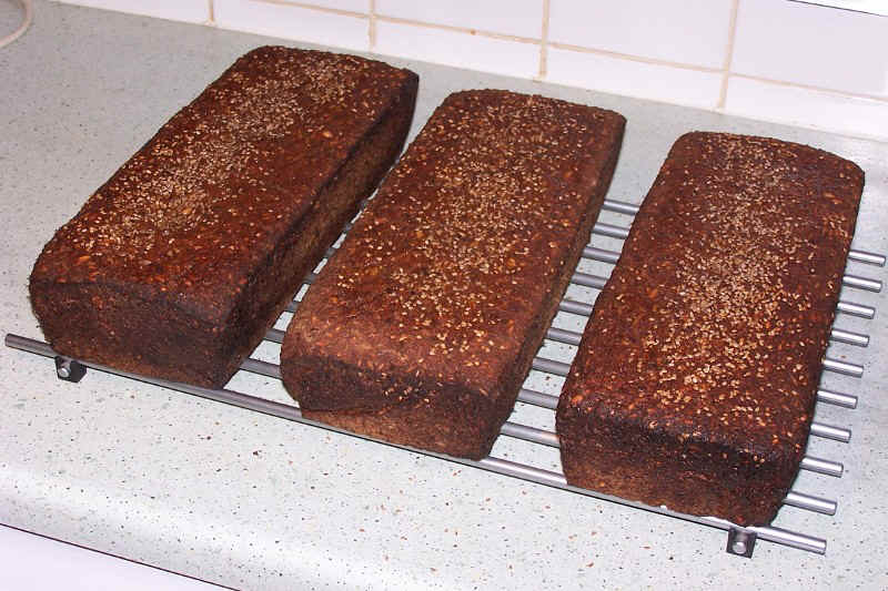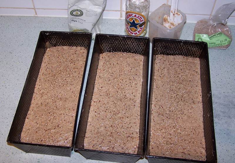 dough batch for next time when you bake again. The three large baking tins I use have a volume each of about 4.5 litre. Grease them up with oil. Cover the bottoms of the tins with baking foil (not aluminium foil) to make life easy when getting the breads out after baking. Put the dough in the tins so they are a bit more than half filled. Even out the doughs in the tins with a flat spoon. Paint the surfaces with a thin layer of oil to preserve the humidity of the breads and to ensure the breads come out with a soft crust. Optionally sprinkle some sesame seed on afterwards for decoration. Cover the tins with alu foil and put them back into the warm place for the dough to raise another 15-20 hours. |