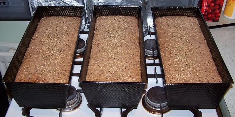 The following recipe is for three large breads. Ingredients that are underlined are critically important whereas the rest you can use at your own discretion. All quantities are approximate measures. The actual mixing of the dough and putting into trays takes less than two hours. But in between the dough needs to raise for several hours and the baking takes about 2.5-3 hours. Therefore I usually schedule a weekend and do large quantities which I then freeze.